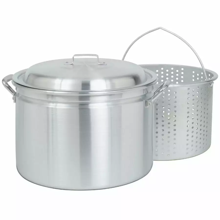 The Bayou Classic 24 Quart Aluminum Stock Pot includes the 24 quart stock pot basket and stock pot lid. The 24 Quart Aluminum Stock Pot differs from our larger stock pots. This stock pot is also considered a steaming pot and lobster pot due to its steaming capabilities. The aluminum stock pot has an indention which holds the stock pot basket off the bottom. This gives you about two inches in the bottom for your liquid for perfect steaming. The Bayou Classic 24 Quart Stock Pot is the perfect addition to any cooking environment. This stock pot is one of the highest quality aluminum stock pots on the market today. It features a vented lid and heavy duty riveted handles. Use the included 24 quart stock pot basket for frying chicken, fish or hushpuppies; steaming or boiling seafood, clams and vegetables. Uses for the 24 quart stock pot without the basket includes boiling soups, stews, gumbo, jambalaya and low country boils. The Bayou Classic 24 Quart Stock Pot measures 14 1/2 inches x 10 1/2 inches. The 24 quart stock pot basket measures 13 1/4 inches x 6 ¼ inches.