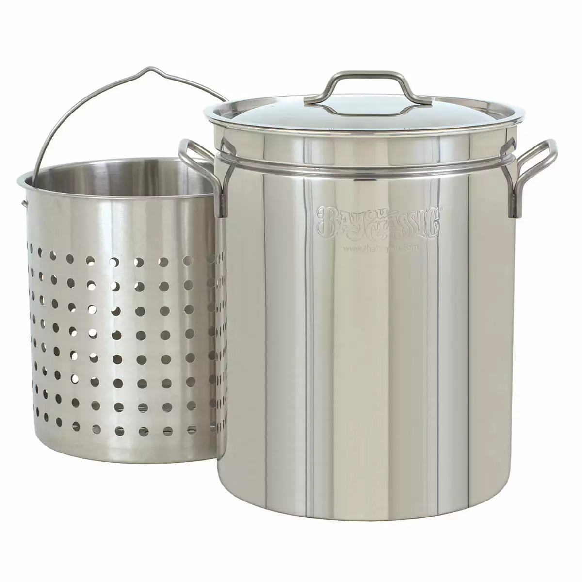 The Bayou Classic 44 Quart Stainless Steel Stock Pot includes the 44 quart stainless steel stock pot, 44 quart stainless steel stock pot basket and stainless steel lid. The Bayou Classic stainless steel stock pots are made of high gauge, restaurant quality stainless steel. This stock pot does have Bayou Classic’s steaming capabilities. The Bayou Classic 44 quart stainless steel stock pot has an indention which holds the stock pot basket off the bottom. This gives you about two inches in the bottom for your liquid for perfect steaming. The Bayou Classic 44 Quart Stainless Steel Stock Pot is the perfect addition to any cooking environment. The Bayou Classic 44 Quart Stainless Steel Stock Pot measures 13 ½ inches x 17 1/4 inches. The 44 quart stainless steel stock pot basket measures 12 ½ inches by 16 ¼ inches. These pots may be used in a commercial atmosphere. All Bayou Classic Stainless Steel Stock Pots are a thicker gauge and grade than most of your stainless steel stock pots. The grade of the stainless steel is 201 and the gauge is 18/8 stainless steel.