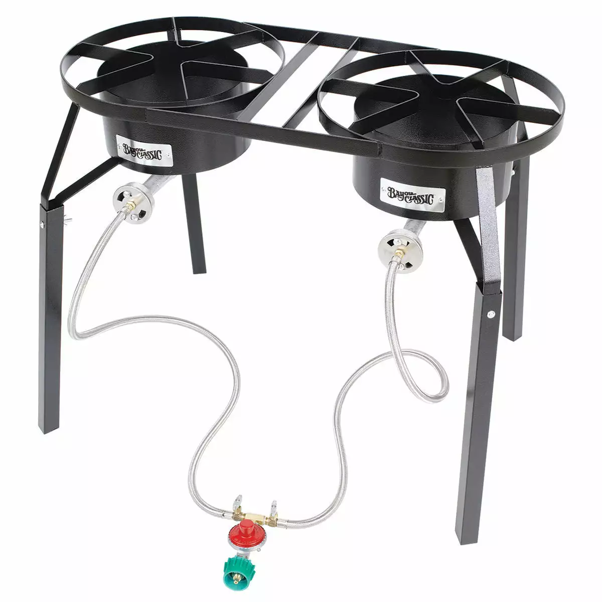 The Bayou Classic Double High Pressure Propane Burner will handle two large sized stock pots up to 60 quarts. This double high pressure propane burner includes two BG10 high pressure cast propane burners. It also includes a 10 PSI regulator kit. This double high pressure propane burner has two 14 inch cooking surfaces, the total length of 31 inches. Each burner has a control valve which allows you to adjust the flame on each individual burner separately. The Bayou Classic Double High Pressure Propane Burner does include extension legs. The original height of this high pressure burner is 13 inches tall. The extension legs raise the height to 25 inches.