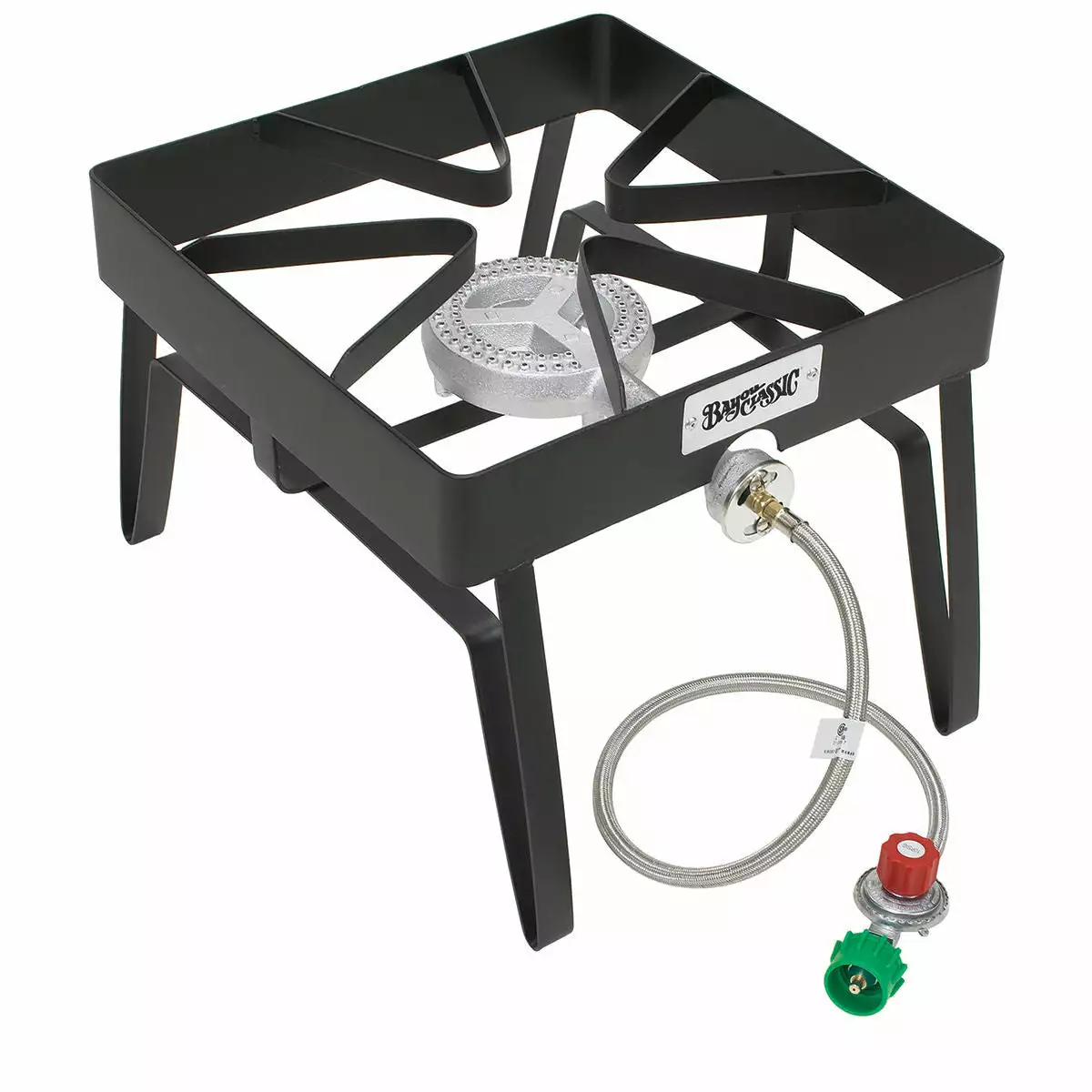 The Bayou Classic Square Propane Burner is one of Bayou Classic’s more popular propane burners. This propane burner’s top measures 16 x 16, which is viewed as more stable than the round propane burners. The height of this propane burner measures 13 inches tall. The needle valve on the square propane burner gives you complete control over the amount of flame, so you can cook food or heat beverages properly. The Bayou Classic Square Propane Burner includes a high pressure regulator.