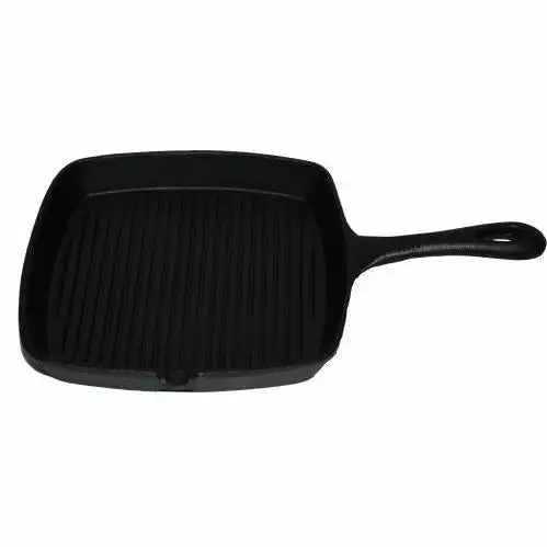 The Cajun Classic skillet is made of cast iron and has an interior of raised ridges in the bottom for more successful stove-top grilling. Inside measurements of the cast iron skillet are 9 inches x 9 inches x 1 inch deep. This Cajun Classic cast iron cookware is pre-seasoned to perfection and ready for use. Cast iron cookware makes for superior heat retention and even heating of foods. Heavy-duty and durable, designed to last for years. Hand wash with stiff brush and hot water.
