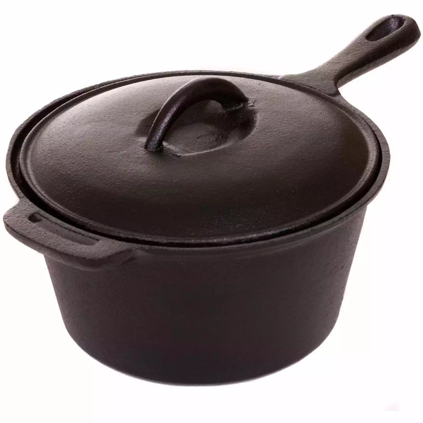 The Cajun Classic Seasoned Sauce Pot is made of heavy duty seasoned cast iron and includes the pictured lid. This cast iron sauce pot’s interior measures 4 inches deep x 8 inches wide, the total exterior length including handle is 12 inches, and it holds approximately 2 quarts. This Cajun Classic pot is pre-seasoned to perfection and ready for use. Cast iron cookware makes for superior heat retention, even heating of foods and provides nutritional iron intake. Heavy-duty and durable, designed to last for years. Hand wash with stiff brush and hot water.