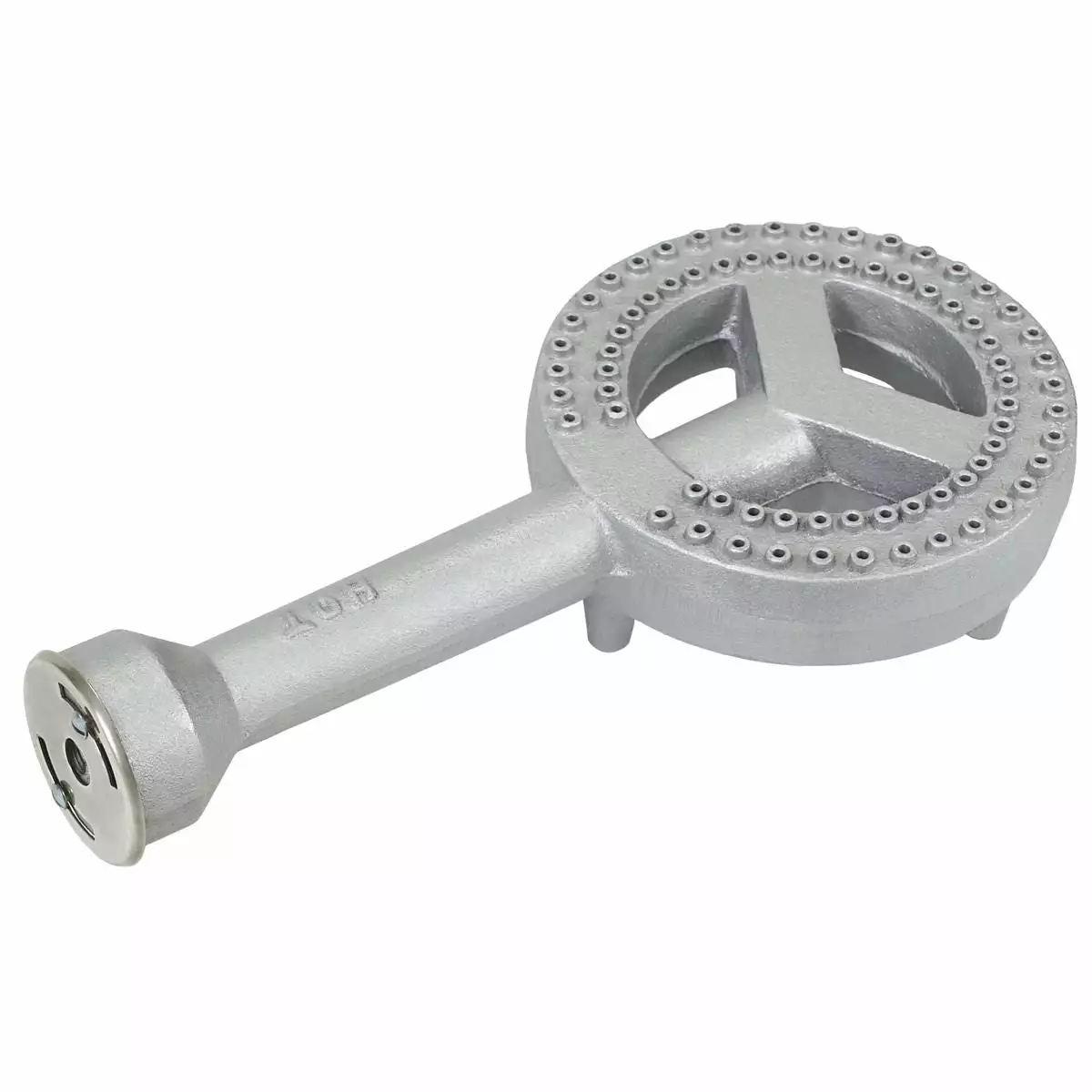 This high pressure cast iron fry burner is considered a high pressure burner but in Cajun terms is low pressure. This cast iron fry burner performs well when used with 10 PSI regulators. If you put a higher BTU, the flame is less controllable. You will also have an issue with the burner receiving too much propane, which will result in your flame blowing itself out. We do use this burner in the Bayou Classic SQ14 propane outdoor cookers and Bayou Classic 1114 stainless steel propane outdoor cookers. The high pressure cast iron fry burner includes the air shutter. Orifices are available for purchase separately. The face of this cast iron burner measures 5 1/2 inches in diameter.
