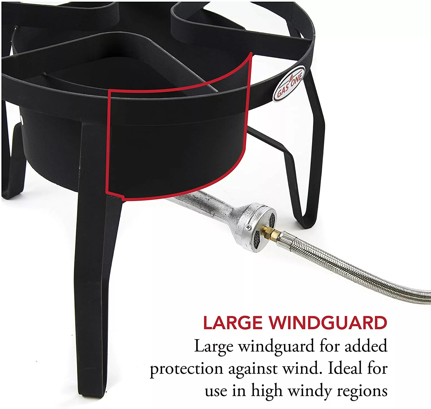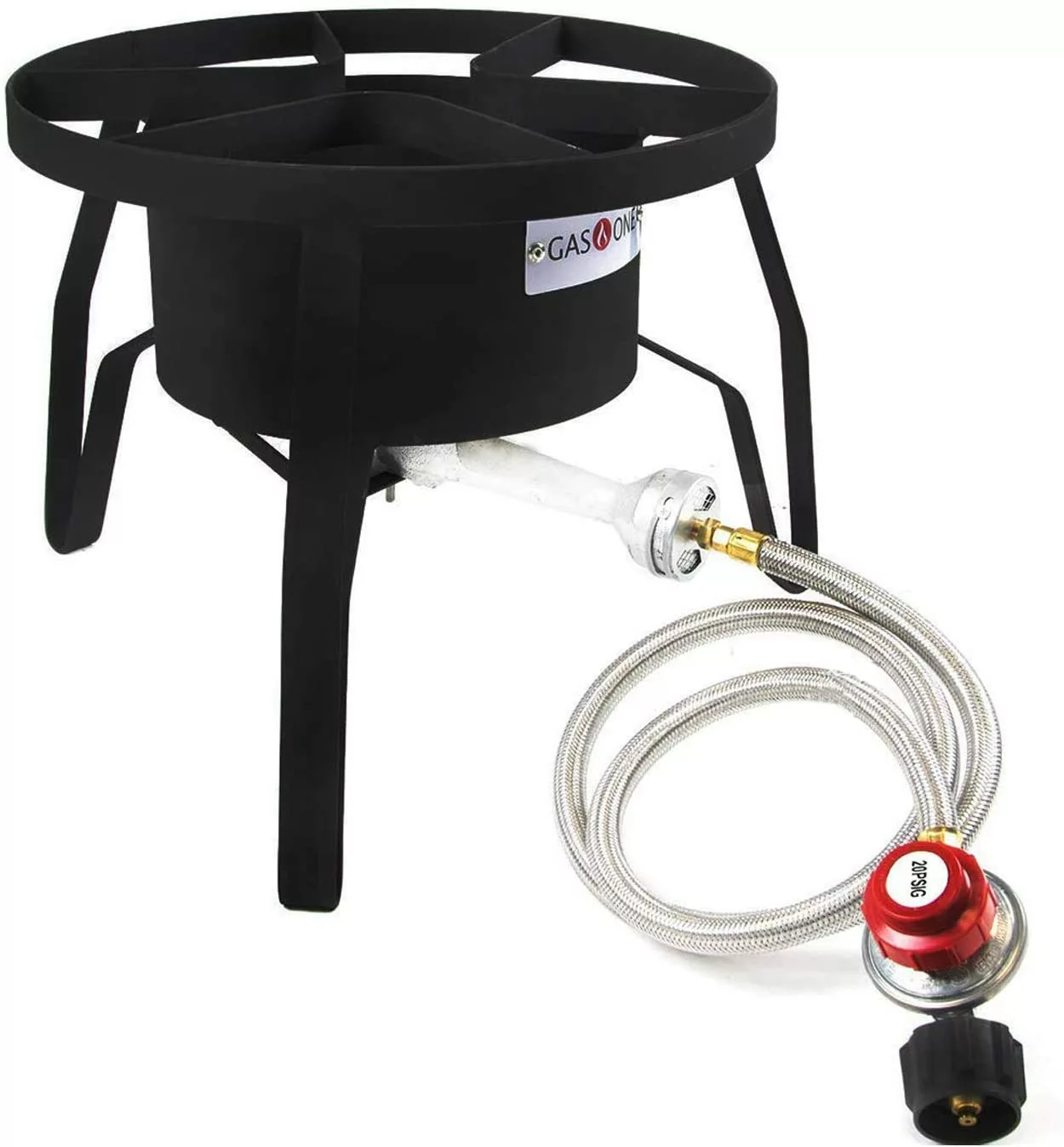 This High Pressure Propane Burner is just like the Bayou Classic SP10 High Pressure Burner. The High Pressure Propane Burner is made of the same quality but is priced so that everyone can afford it. The High Pressure Propane Burner has a high BTU output. You can adjust the heat down to simmer a cup of coffee or fire it up to boil up to 120 quart pot. The High Pressure Propane Burner connects to a 20 lb propane tank cylinder – just like your propane gas grill. One thing that makes this propane burner better than the SP10 Bayou Classic burner is the height. That’s the only difference. The High Pressure Propane Burner sits one inch lower – which makes is more stable for your larger pots.