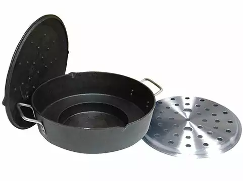 This pre-seasoned cast iron dutch oven uses less oil when frying pork chops, cauliflower or wings. Steam tamales or seafood with the steam plate. Blacken fish or chicken. Pan Fry! Deep Fry! Stir Fry! Steam!