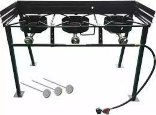 Heavy duty, bolt together portable propane triple burner outdoor cooker. CSA Design Certified Unit. Use with up to a 30 Qt. pot.