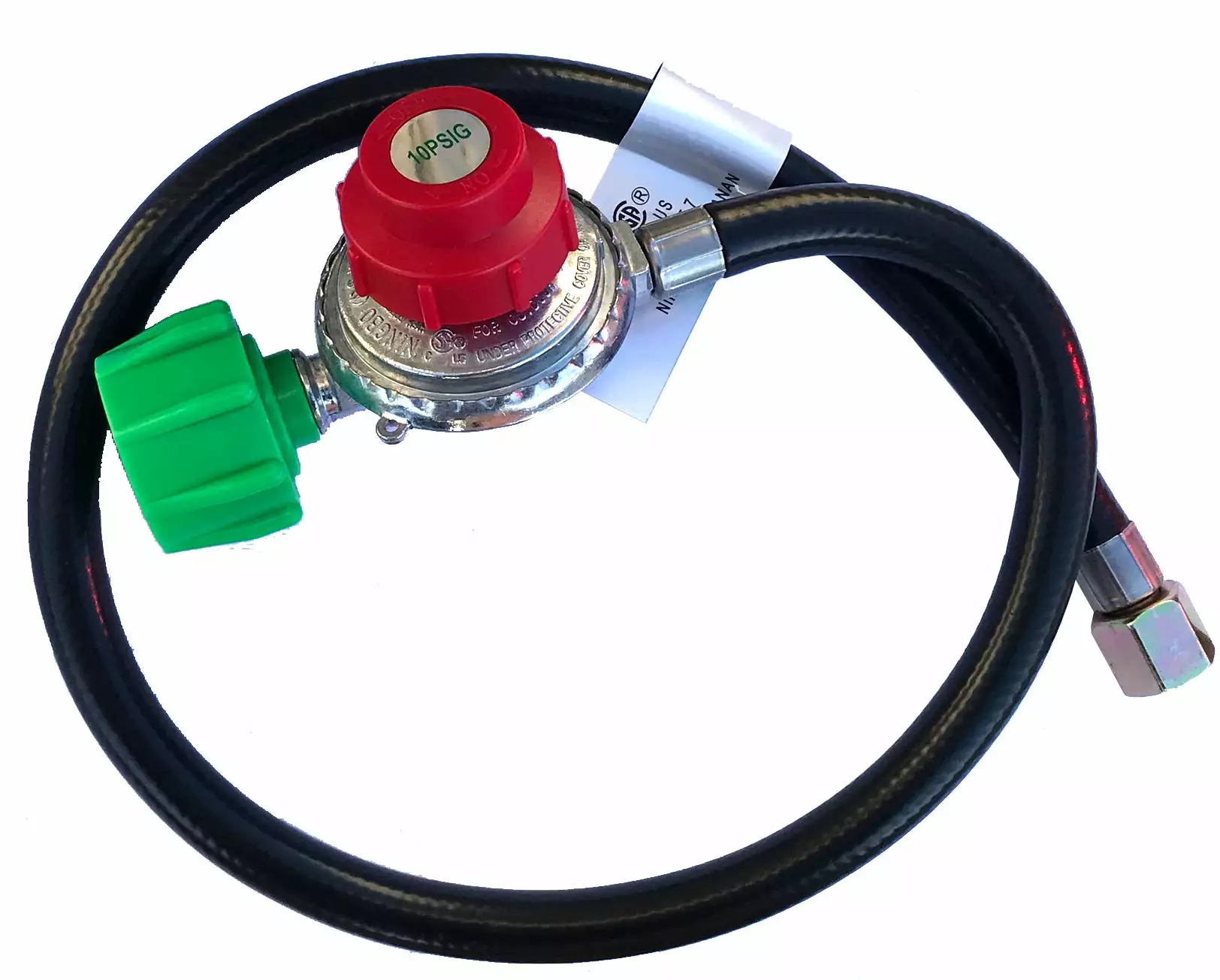 Listed High Pressure Adjustable Regulator with Type 1 Connection and Listed LP Hose with Female Flare Swivel.