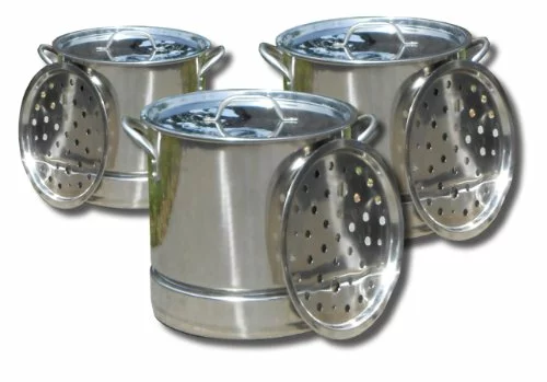 Professional Stainless Steel Stock Pot Set includes three large stainless steel stock pots with lids and steamer plates. The steamer plates make the Professional Stainless Steel Stock Pot Set steamer pots. This Professional Stainless Steel Stock Pot Set is made of stainless steel for easy cleaning and low maintenance. The Professional Stainless Steel Stock Pot Set includes 32, 44 and 52 quart stainless steel stock pots with lids.