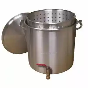 Aluminum boiling pot with stainless steel locking drain valve, lid & basket. Sizes: 120 qt. . Boil all your favorites in large quantities! Remove easily from the pot with the strainer basket. Easy draining of liquid and cleanup with the lever handled valve. Let’s you eat like a King!