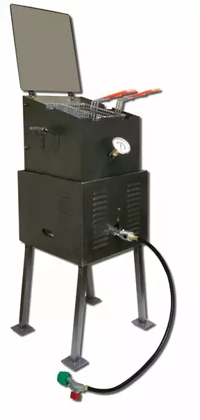 Fry, Boil and Steam. Fry up to a 14-pound Turkey. “V” Bottom Deluxe Multi-Purpose Portable Propane Outdoor Cooker Package. Rectangular Portable Propane Outdoor Cooker with Recessed Top and Snap On Legs, Unique Design 50,000 BTU Tubular Steel U-Shaped Burner, Aluminum “V” Bottom Rectangular Pot with Hinged Lid and Spiral Cool Grip Handles with Spigot for Easy Draining, 2 Smaller Chrome Plated Baskets with Heat Resistant Handles, Listed LP Hose and Regulator with Type 1 Connection, CSA Certified Battery Operated Timer, Large Stationary Deep Fry Thermometer, Instruction/Recipe Booklet. CSA Design Certified